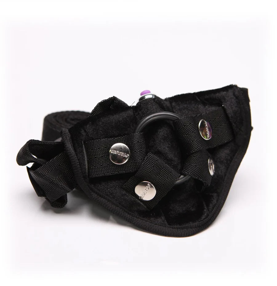 The Velvet Vibrating Harness is comfortable, adjustable, and machine washable, with a pocket for a bullet vibrator (included). Also includes an interchangeable O-ring so the harness can be used with other toys.